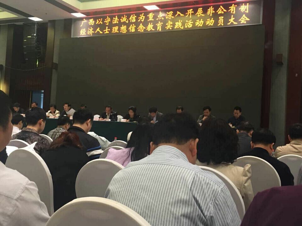 2014年4月13日我司胡永董事長(zhǎng)在南國(guó)弈園三樓弈緣廳參與了廣西以守法誠(chéng)信為重點(diǎn)深入開展非公有制經(jīng)濟(jì)人士理想信念教育實(shí)踐活動(dòng),本次大會(huì)由自治區(qū)政協(xié)副主席、工商聯(lián)主席磨長(zhǎng)英同志主持,大會(huì)共歷時(shí)兩天,2014年4月14日結(jié)束。