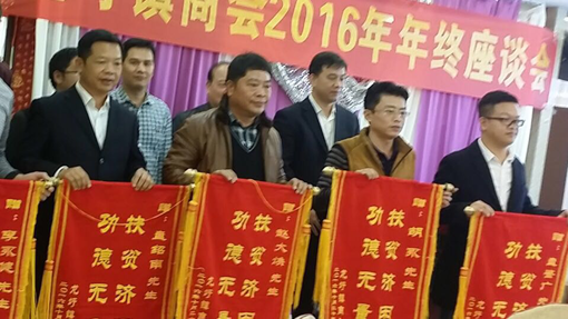 會中龍圩商會為參加“脫貧問苦公益活動”的會員頒旗儀式。我公司董事長胡永先生上臺接受錦旗。