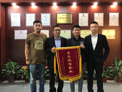 2017年11月14日,我公司長期合作的供應(yīng)商:上海河姆渡實業(yè)發(fā)展有限公司來到我公司授予“最具誠信企業(yè)”錦旗。