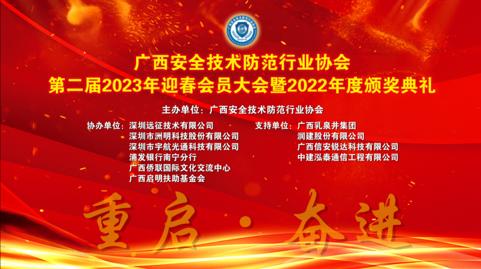 2023年2月24日,廣西安防協(xié)會(huì)第二屆2023年迎春會(huì)員大會(huì)暨2022年度頒獎(jiǎng)典禮在南寧飯店成功舉辦。本次大會(huì)主題為“重啟 · 奮進(jìn)”。會(huì)中對(duì)榮獲2022年十大優(yōu)秀工程(集成)商、優(yōu)質(zhì)安防工程、優(yōu)秀項(xiàng)目經(jīng)理、抗疫防控先進(jìn)單位、先進(jìn)個(gè)人等獎(jiǎng)項(xiàng)進(jìn)行表彰頒獎(jiǎng)。